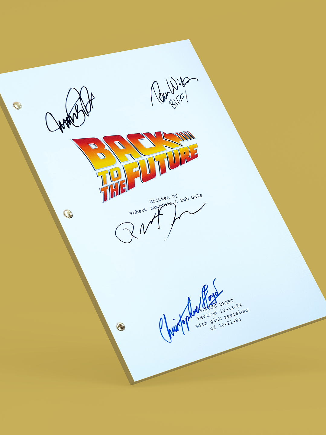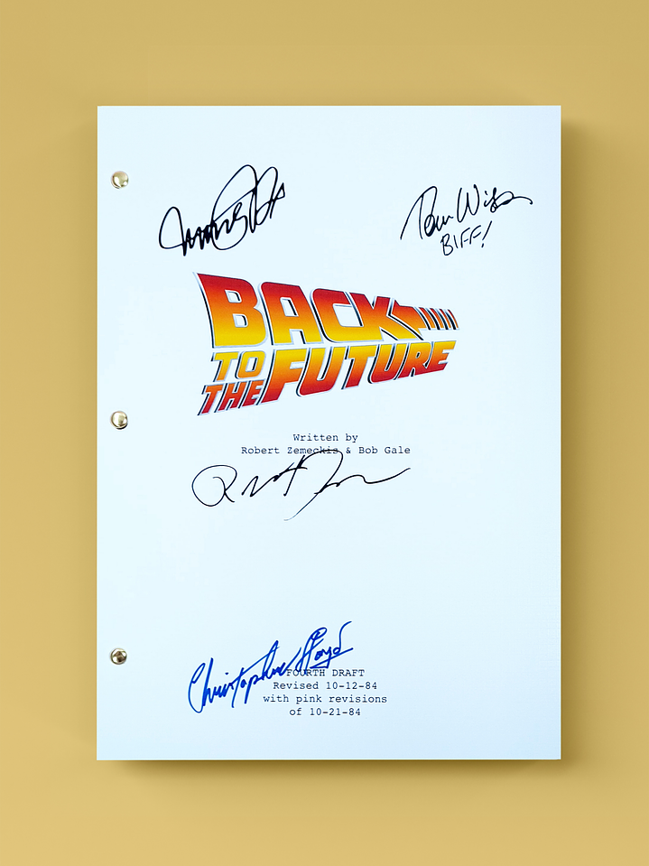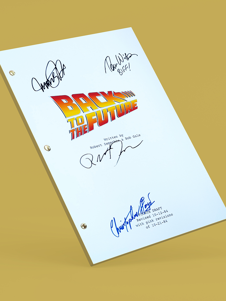 Edición premium del guión completo del clásico de ciencia ficción "Volver al Futuro" con las firmas digitalizadas del director Robert Zemeckis y 3 miembros del elenco principal impresas en portada de alto gramaje. Incluye lámina dorada adhesiva con el mapa de ubicación de cada firma.