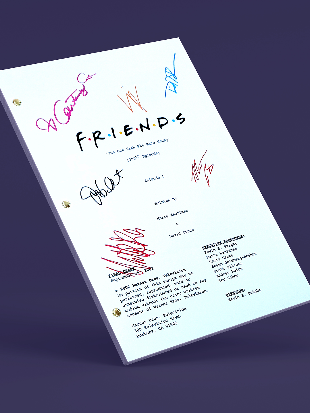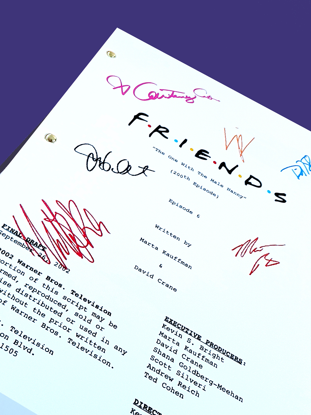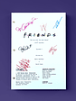 "Friends" narra las aventuras y desventuras de seis jóvenes de Nueva York. Rachel (Jennifer Aniston), Monica (Courteney Cox), Phoebe (Lisa Kudrow), Ross (David Schwimmer), Chandler (Matthew Perry) y Joey (Matt LeBlanc) forman una unida pandilla de amigos que viven en Manhattan y que suelen reunirse en sus apartamentos o en su bar habitual, el Central Perk. A pesar de los numerosos cambios que se producen en sus vidas, su amistad es inquebrantable en la dura batalla por salir adelante en sus periplos profesionales y personales. LAS FIRMAS INCLUIDAS SON: Jennifer Aniston Courteney Cox Lisa Kudrow Matt LeBlanc Matthew Perry David Schwimmer