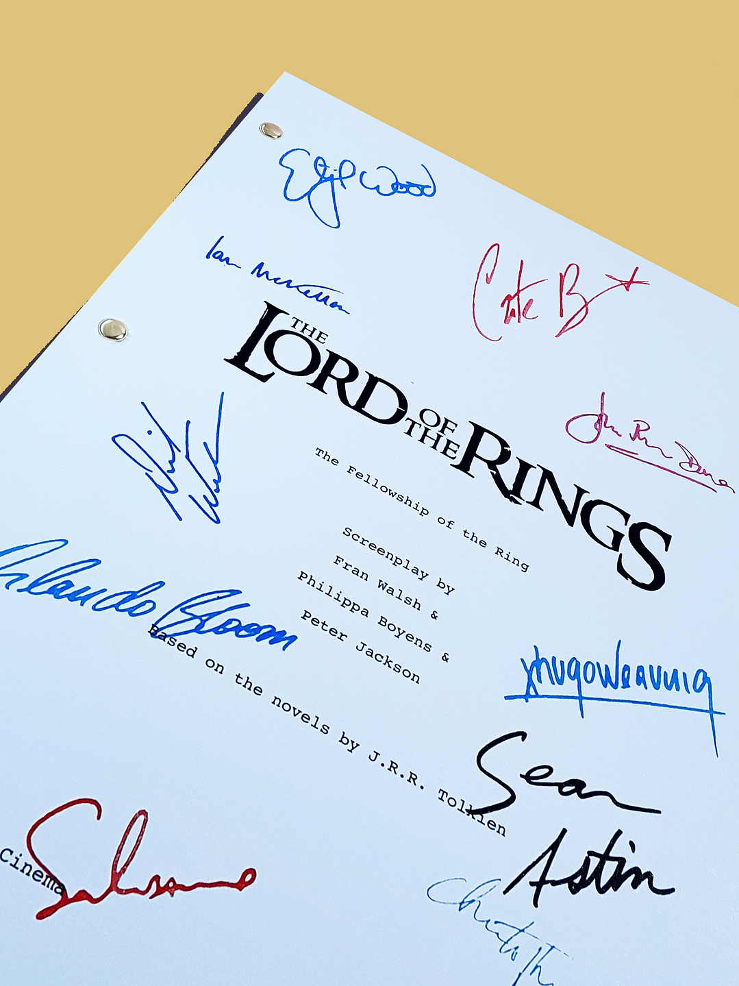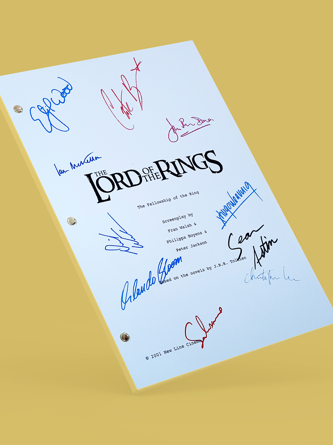 Edición premium del guión completo de 172 páginas del épico de fantasía "El Señor de los Anillos: La Comunidad del Anillo" con las firmas digitalizadas de 15 miembros del elenco principal impresas en portada de alto gramaje. Incluye lámina dorada adhesiva con el mapa de ubicación de cada firma.