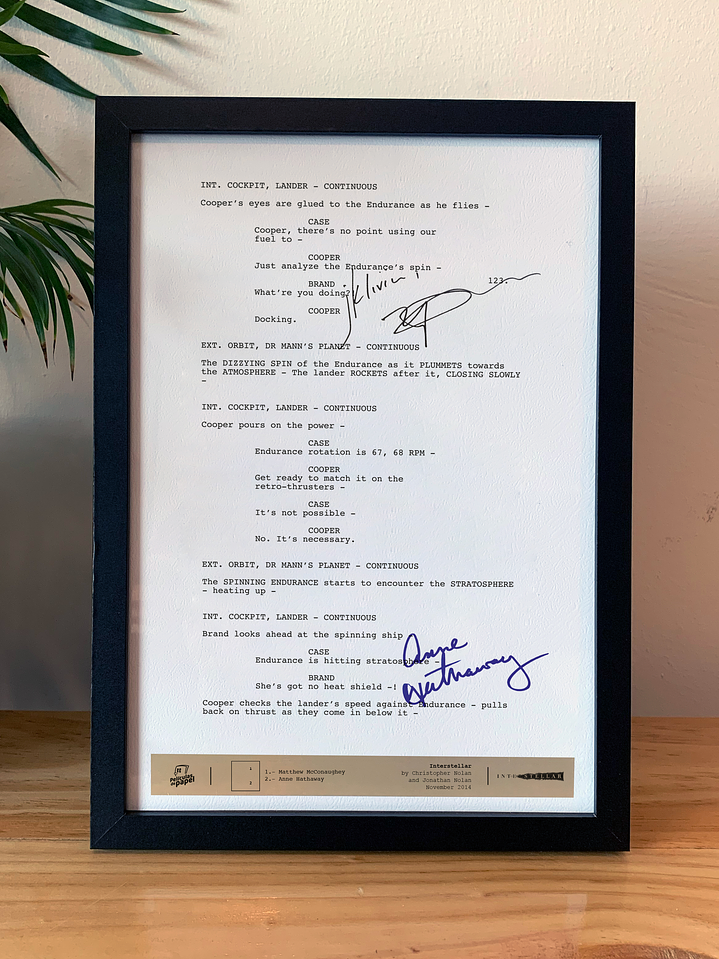 El producto: Escena creada en papel de alta calidad con relieve, viene con las firmas digitalizadas de los protagonistas. En su parte inferior aparece el plano de características en papel metalizado dorado. Todo protegido en un marco de madera negro moderno y de calidad. La escena: Cooper en una arriesgada maniobra, arriesga todo para poder acoplar su nave al Endurance de forma manual. Una escena llena de vertigo y suspenso. Firmas que aparecen: Matthew McConaughey Anne Hathaway