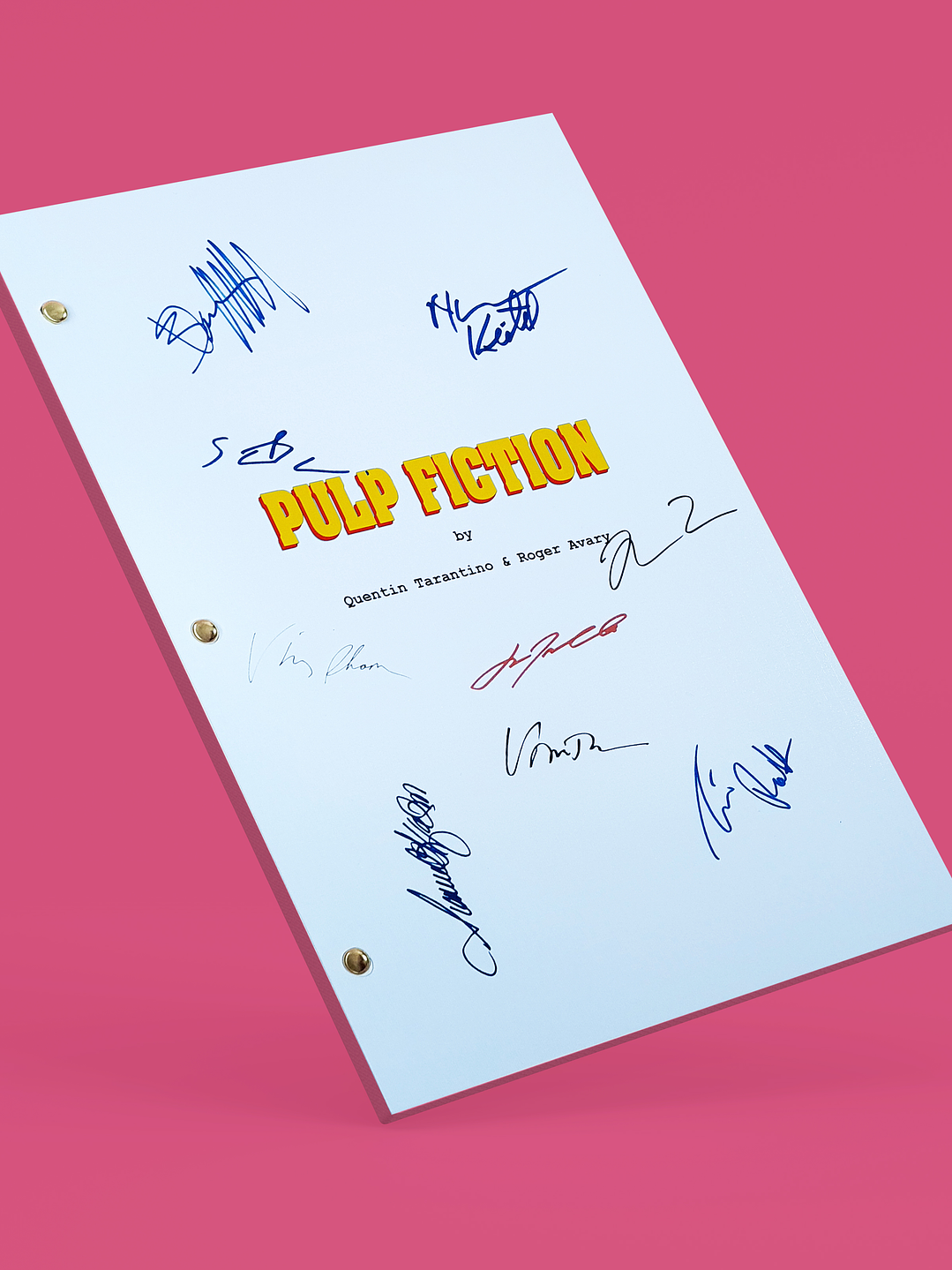 Jules y Vincent, dos asesinos a sueldo con no demasiadas luces, trabajan para el gángster Marsellus Wallace. Vincent le confiesa a Jules que Marsellus le ha pedido que cuide de Mia, su atractiva mujer. Jules le recomienda prudencia porque es muy peligroso sobrepasarse con la novia del jefe. Cuando llega la hora de trabajar, ambos deben ponerse "manos a la obra". Su misión: recuperar un misterioso maletín. LAS FIRMAS INCLUIDAS SON: Quentin Tarantino John Travolta Samuel L. Jackson Uma Thurman Harvey Keitel Tim Roth Bruce Willis