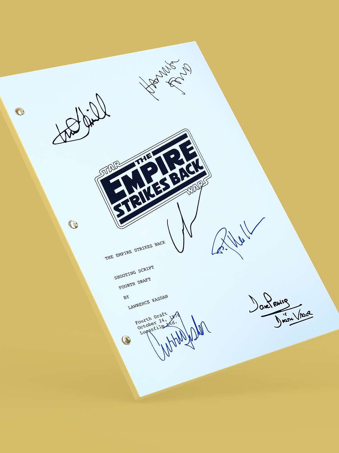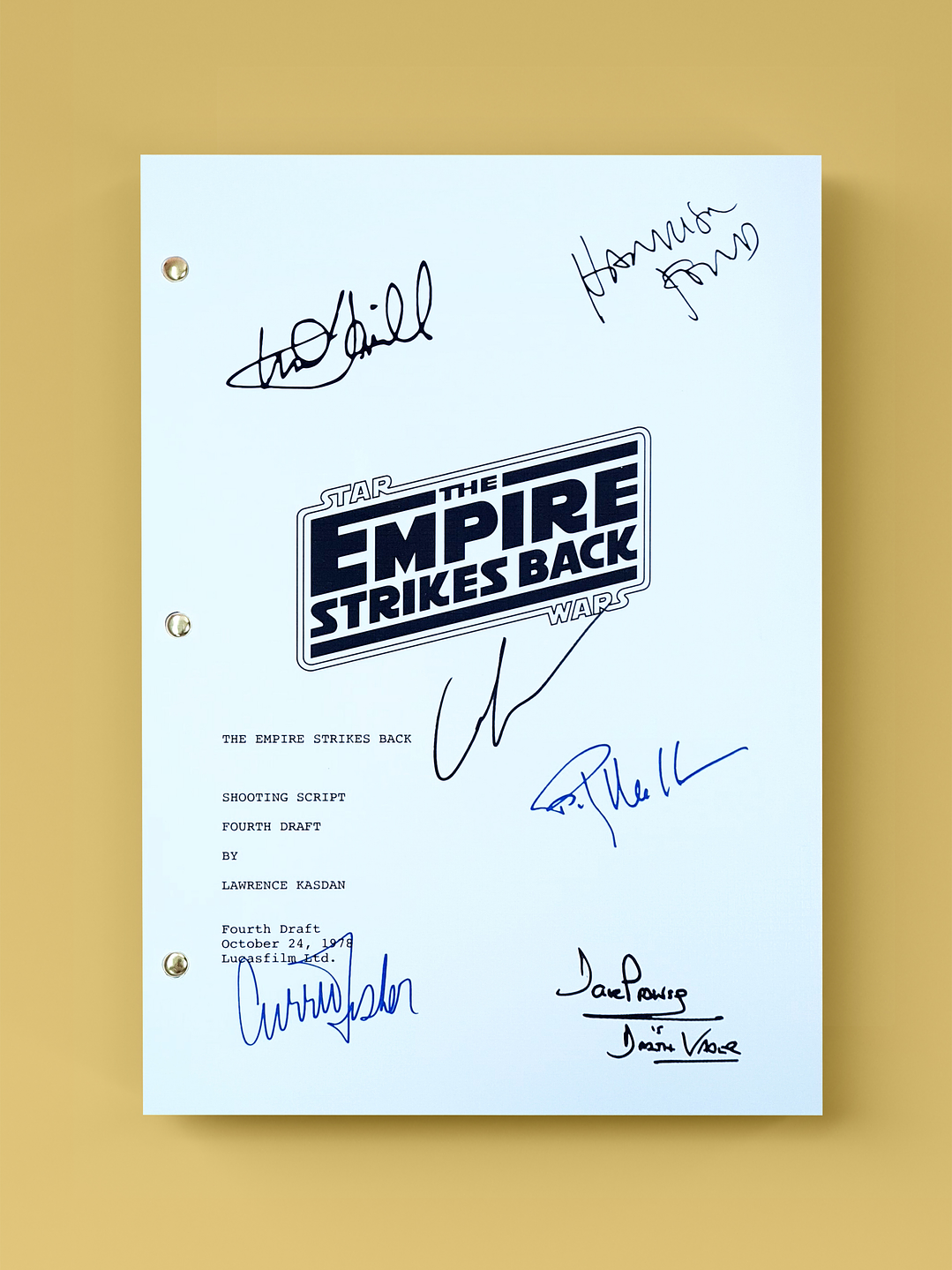 Edición premium del guión completo del clásico de ciencia ficción "Star Wars: El Imperio Contraataca" con las firmas digitalizadas del director George Lucas y 5 miembros del elenco principal impresas en portada de alto gramaje. Incluye lámina dorada adhesiva con el mapa de ubicación de cada firma.