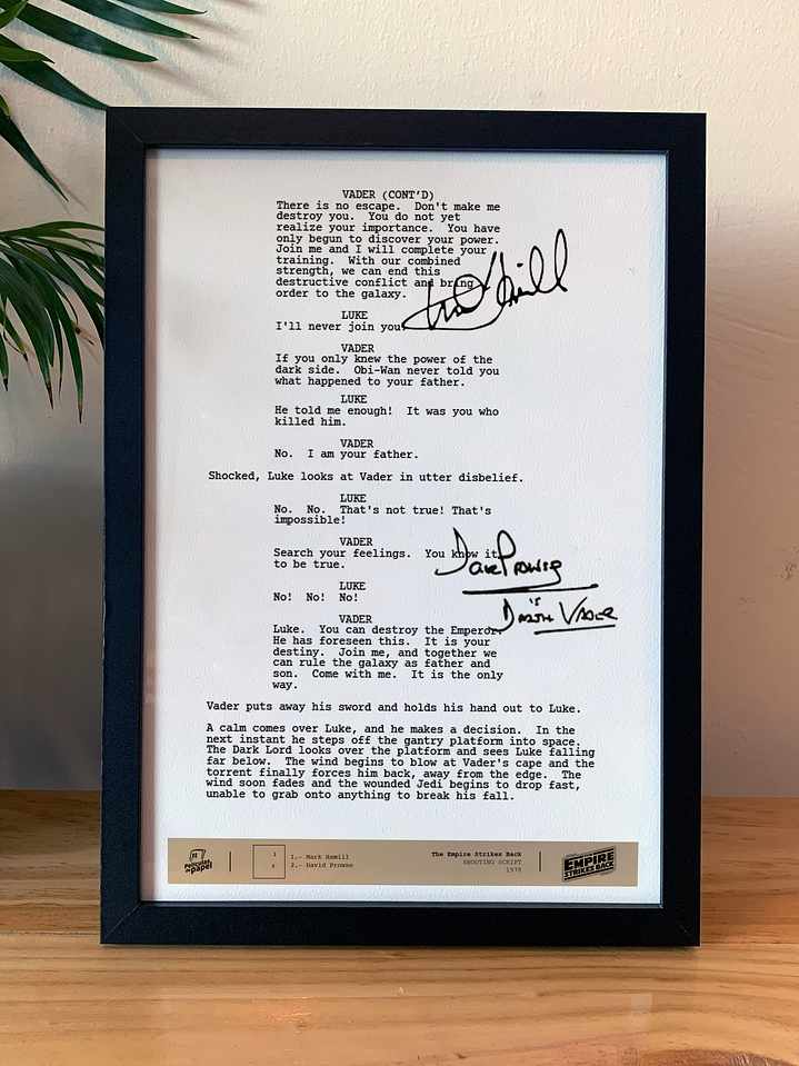 El producto: Escena creada en papel de alta calidad con relieve, viene con las firmas digitalizadas de los protagonistas. En su parte inferior aparece el plano de características en papel metalizado dorado. Todo protegido en un marco de madera negro moderno y de calidad. La escena: La frase más icónica de la franquicia: Cuando Darth Vader dice, "Luke, yo soy tu padre", mientras se enfrenta a Skywalker en un puente espacial, sin lugar a dudas uno de los giros más importantes en la historia del cine cuando la película fue estrenada allá por 1980. Esta frase no aparece en el guión original y solo fue conocida por Mark hamill, George Lucas, y el director Irvin Kersher, guardando este secreto por más de un año filmando. En este cuadro retratamos una adaptación del guión que incluye los diálogos que aparecen en la película. Firmas que aparecen: Mark Hamill David Prowse