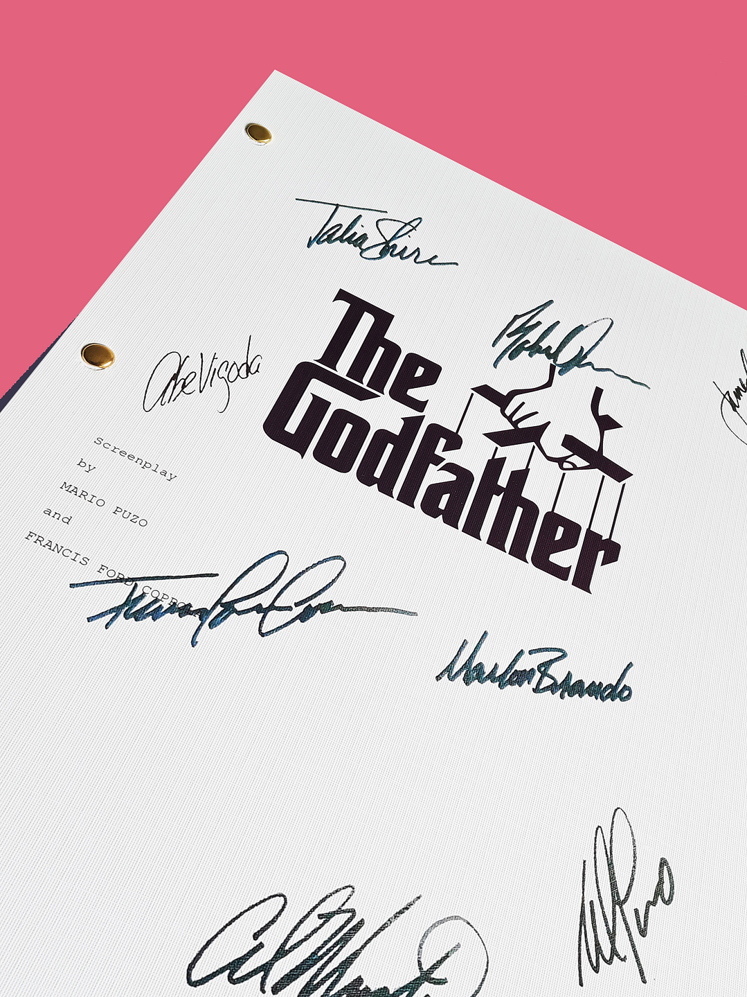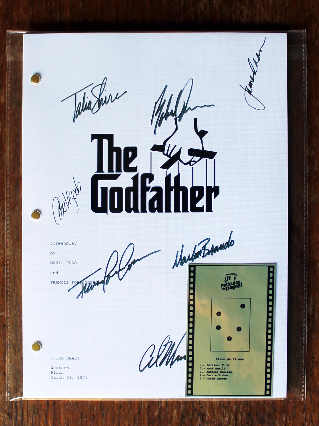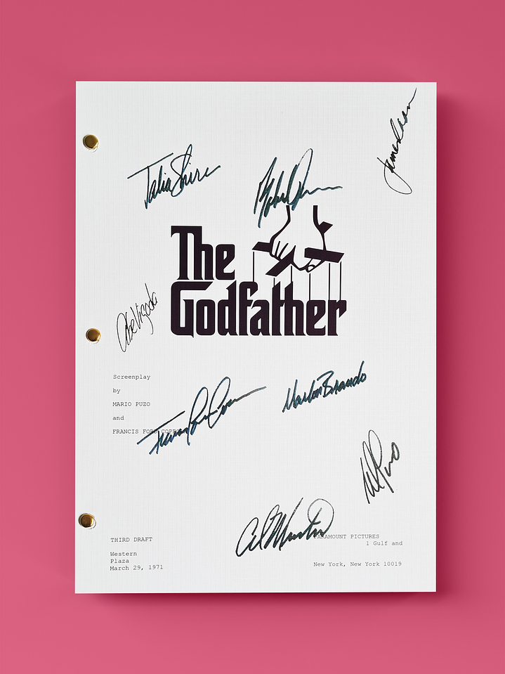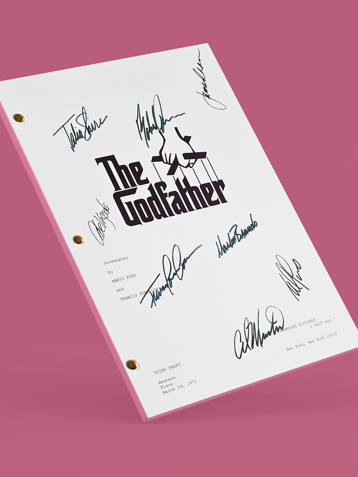 Edición premium del guión completo del clásico drama criminal "El Padrino" con las firmas digitalizadas del director Francis Ford Coppola y 5 miembros del elenco principal impresas en portada de alto gramaje. Incluye lámina dorada adhesiva con el mapa de ubicación de cada firma.