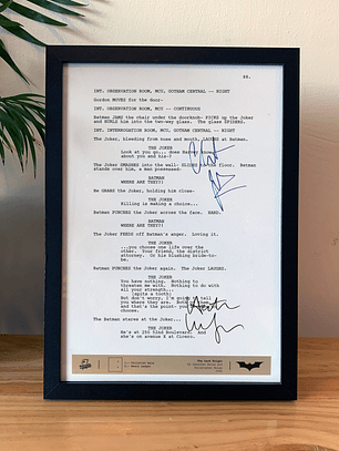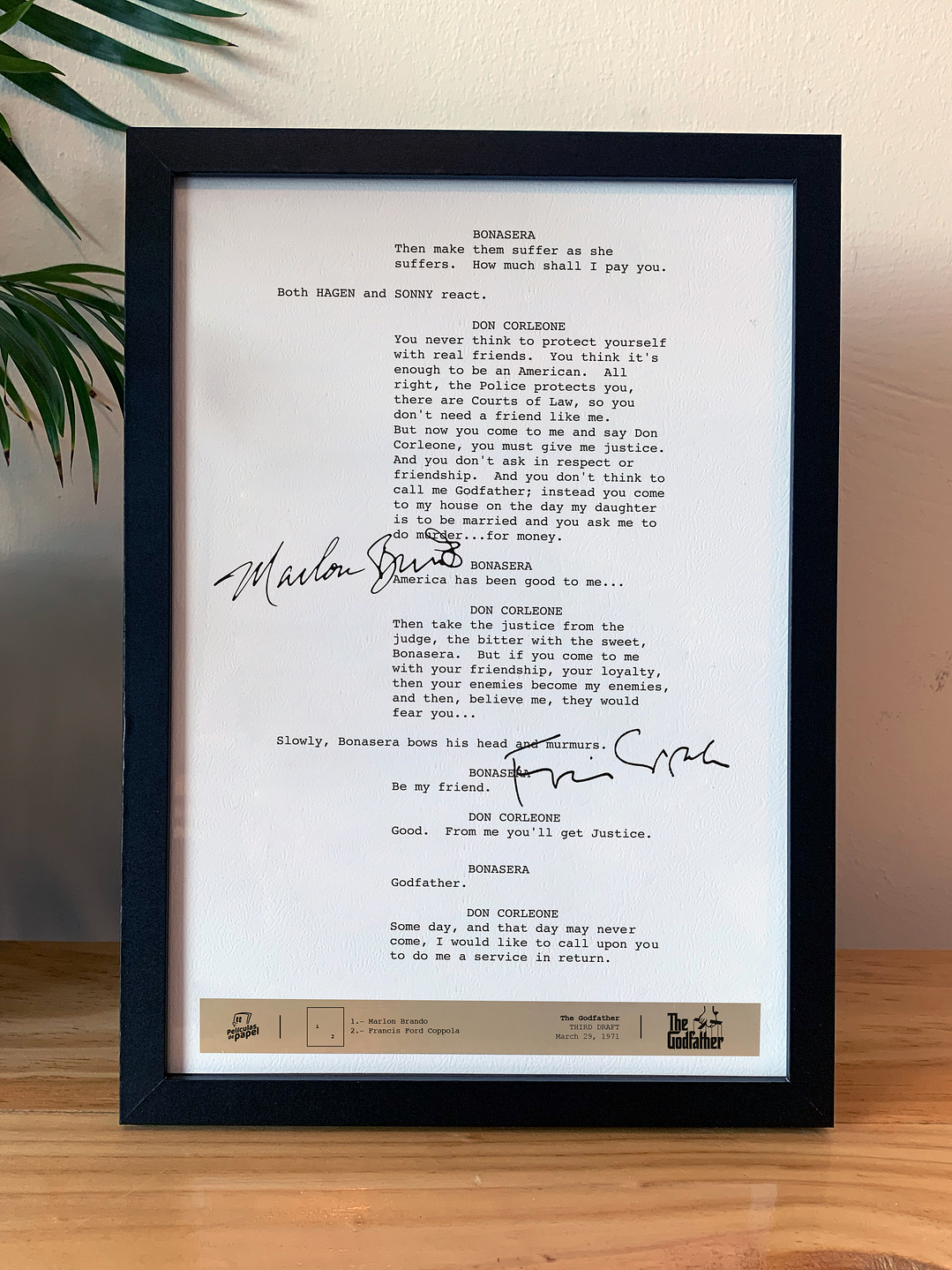 El producto: Escena creada en papel de alta calidad con relieve, viene con las firmas digitalizadas de los protagonistas. En su parte inferior aparece el plano de características en papel metalizado dorado. Todo protegido en un marco de madera negro moderno y de calidad. La escena: Escena sublime de la historia del cine. La familia Corleone no es simplemente una banda de mafiosos, sino que se manejan con otros códigos, les molesta que alguien vaya con la frialdad de un cliente en lugar de ir como un amigo. De esta manera, desde su primera escena, El padrino construye una presentación de la familia Corleone que resulta sutil pero compleja, de una forma clara y rápida que está bien integrada a la historia y que resulta en un gran ejemplo de cómo iniciar una película. Firmas que aparecen: Marlon Brando Francis Ford Coppola