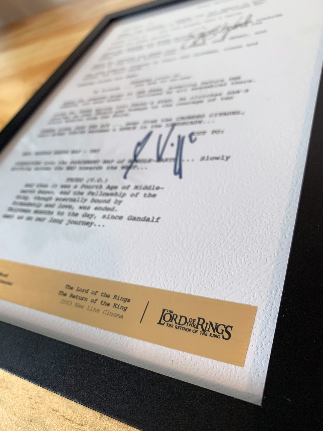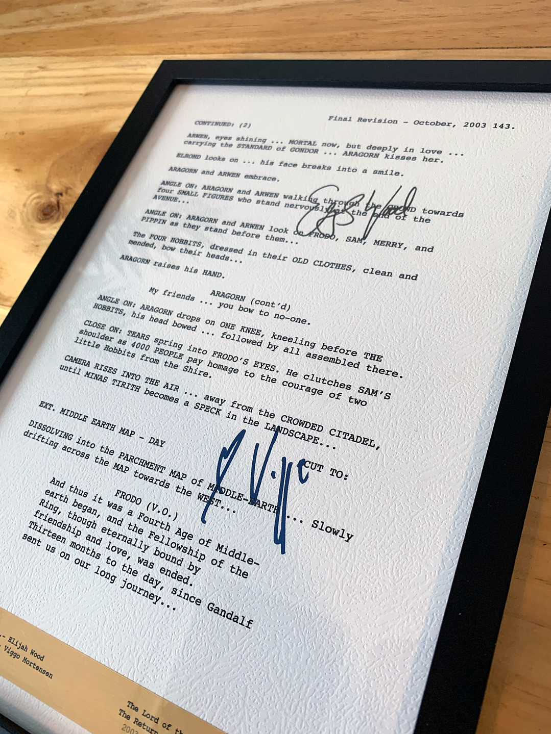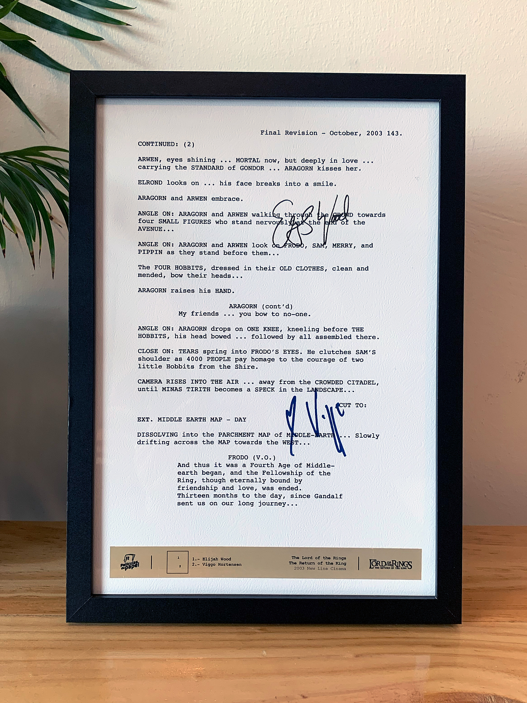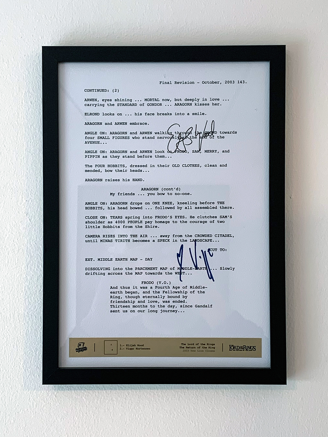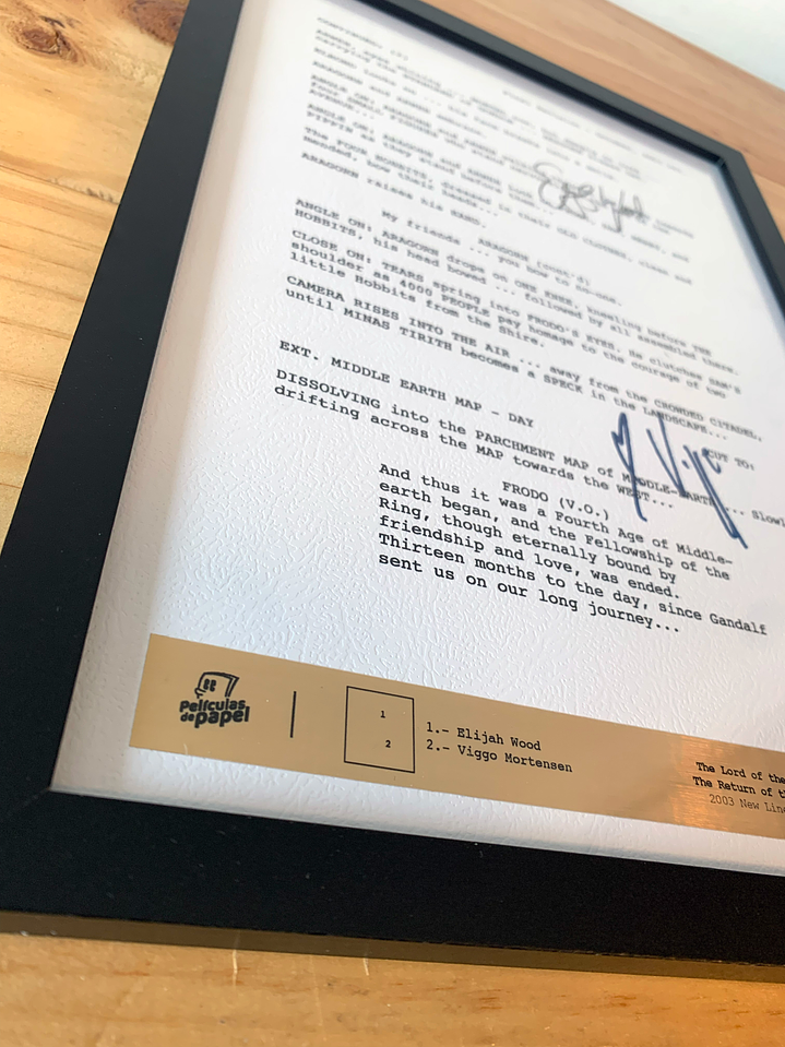 El producto: Escena creada en papel de alta calidad con relieve, viene con las firmas digitalizadas de los protagonistas. En su parte inferior aparece el plano de características en papel metalizado dorado. Todo protegido en un marco de madera negro moderno y de calidad. La escena: Termina la gran aventura de Frodo y sus amigos, Aragorn Ya fue coronado como rey y todo esta volviendo a la paz tan añorada. Firmas que aparecen: Viggo Mortensen Elijah Wood
