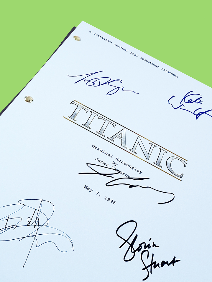 Jack (DiCaprio), un joven artista, gana en una partida de cartas un pasaje para viajar a América en el Titanic, el transatlántico más grande y seguro jamás construido. A bordo conoce a Rose (Kate Winslet), una joven de una buena familia venida a menos que va a contraer un matrimonio de conveniencia con Cal (Billy Zane), un millonario engreído a quien sólo interesa el prestigioso apellido de su prometida. Jack y Rose se enamoran, pero el prometido y la madre de ella ponen todo tipo de trabas a su relación. Mientras, el gigantesco y lujoso transatlántico se aproxima hacia un inmenso iceberg. LAS FIRMAS INCLUIDAS SON: